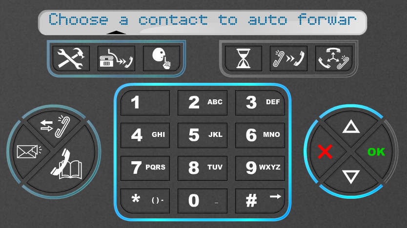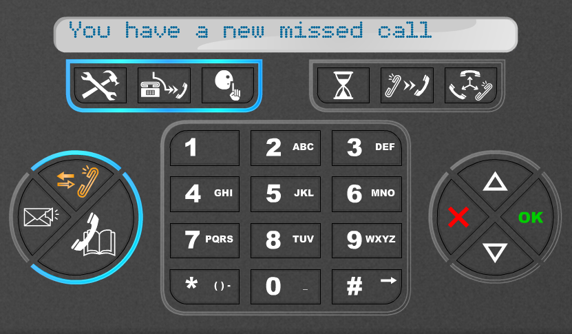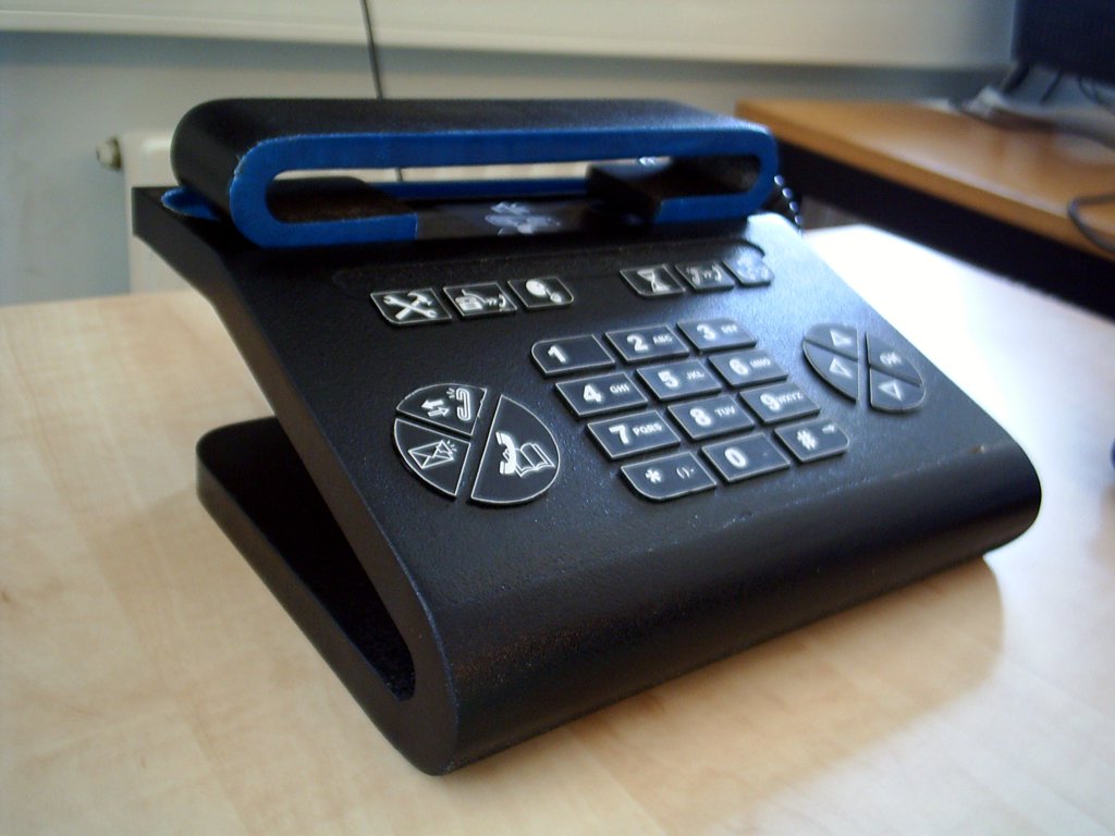 The redesign of the phone offers a ‘downgrade’ from the current phone in the sense that it does not support as many functions as the IP Touch 4018, but just the basic functionality that could be used by an average office employee. It bears a basic and simple form, keeping in equilibrium straight and curved surfaces and shapes. The phone is black and the color blue is used as secondary color not only for decoration, but also for certain usecues. The functions are directly accessible through buttons with icons.