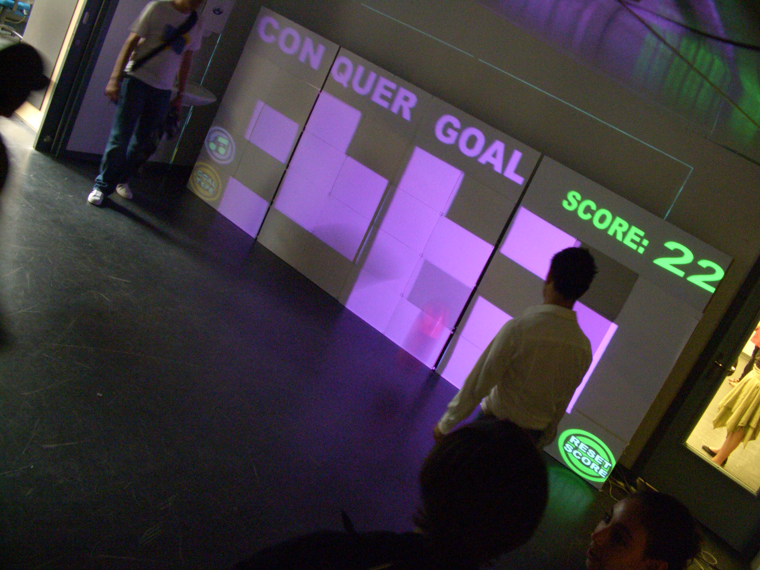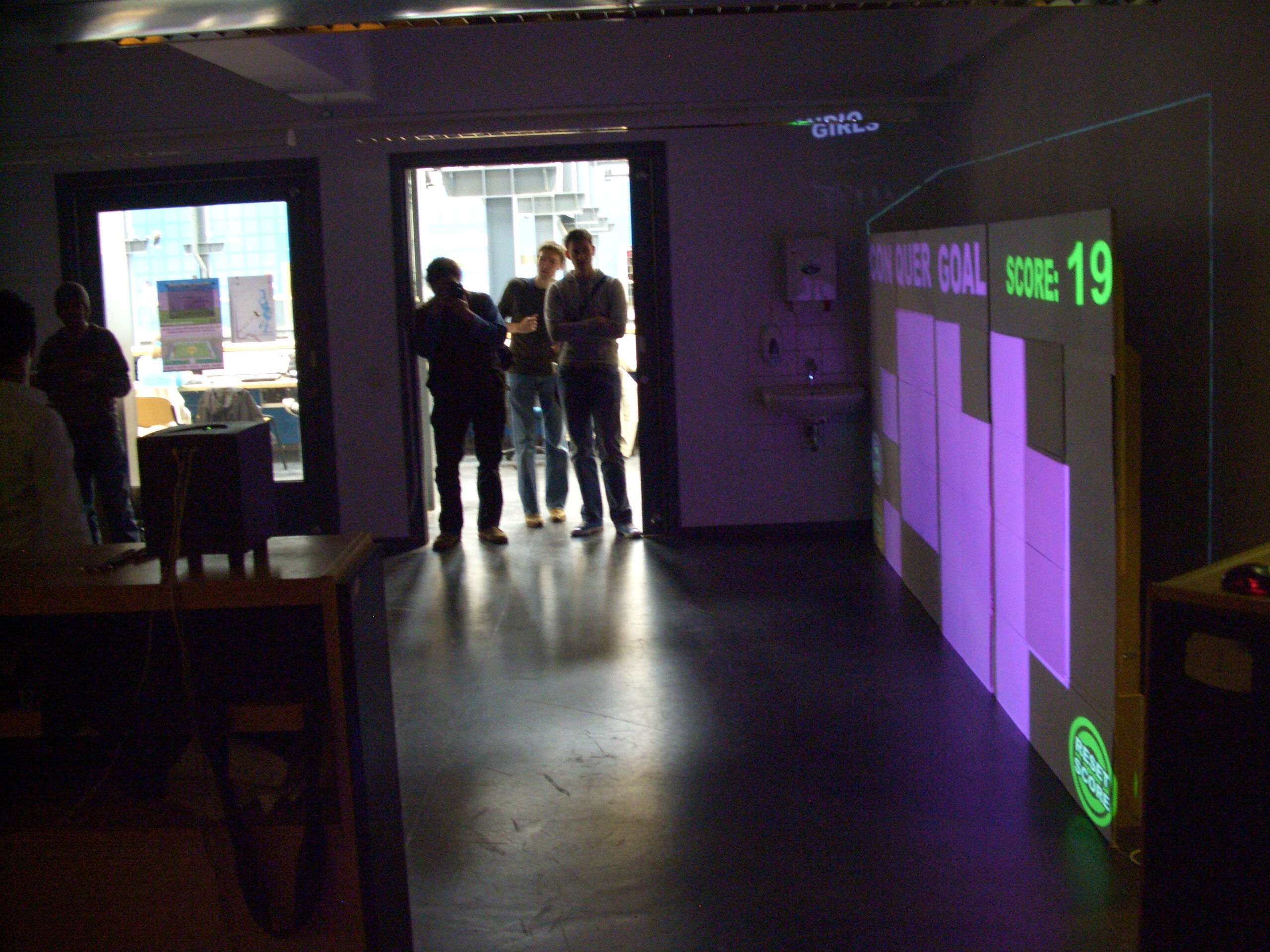 The chosen concept was “VirtualGoals”, in which the physical goals of the court are replaced by hit sensitive walls which act as a giant display for a variety of virtual goals such as moving goals, goals changing randomly in size and position and a goal which reduces its size every time the opposing team scores, to make it harder for them to score again. The interactive surfaces work independent of each other, so the users can make combinations of different goal types (see the first video below).