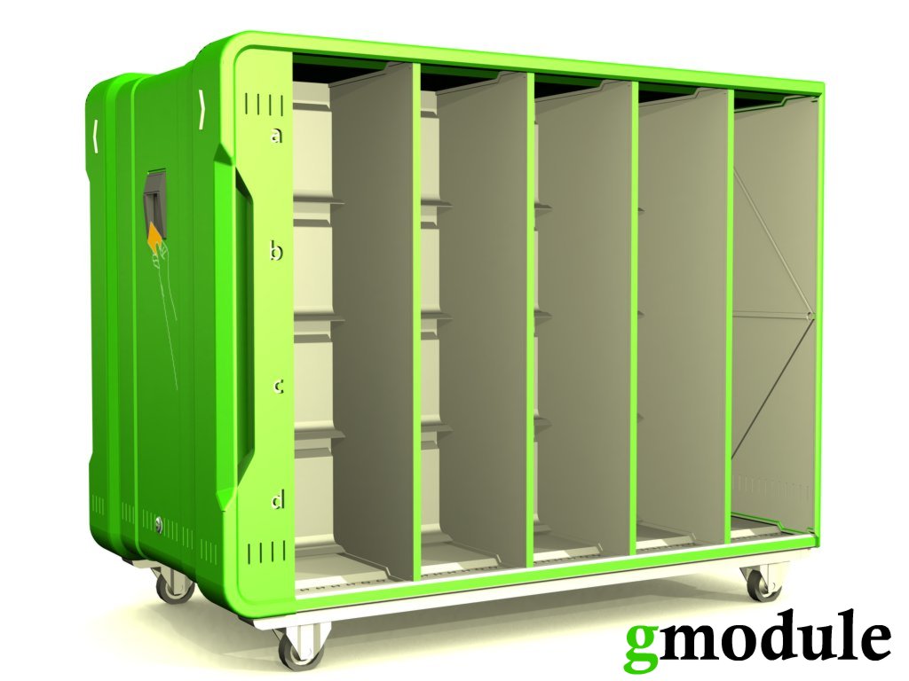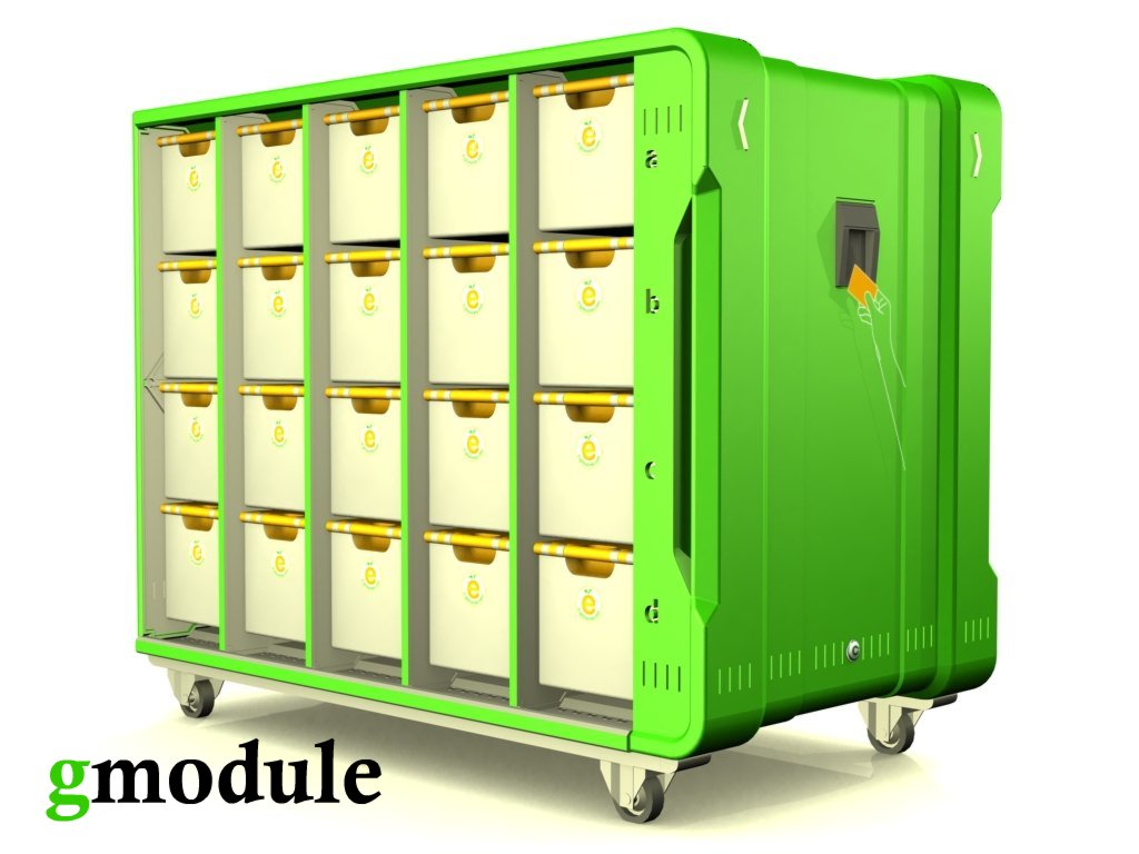 g-module – The g-modules are containers with empty space to organize different kind of goods. For the case study this container has a system of panels that provide room for the g-boxes with a locker system, a card reader (to activate the lock system) and a podium with wheels. The g-module works as a dispenser of g-boxes in the P+R (Park and Ride).